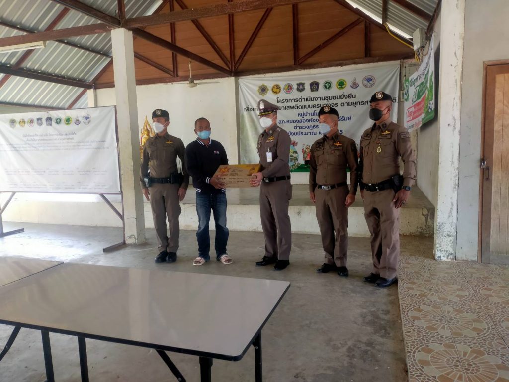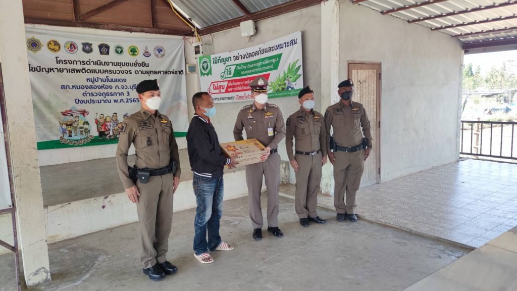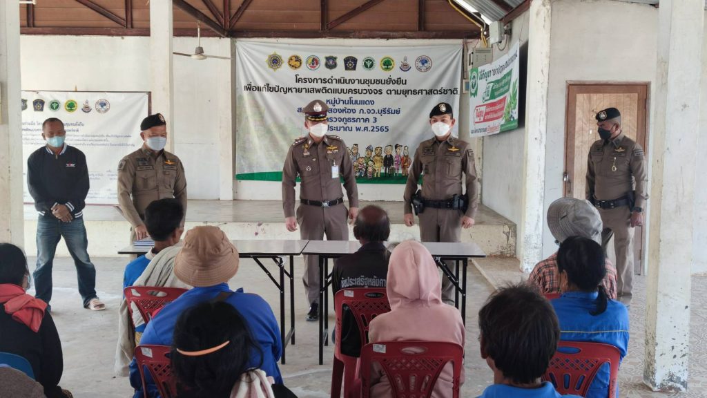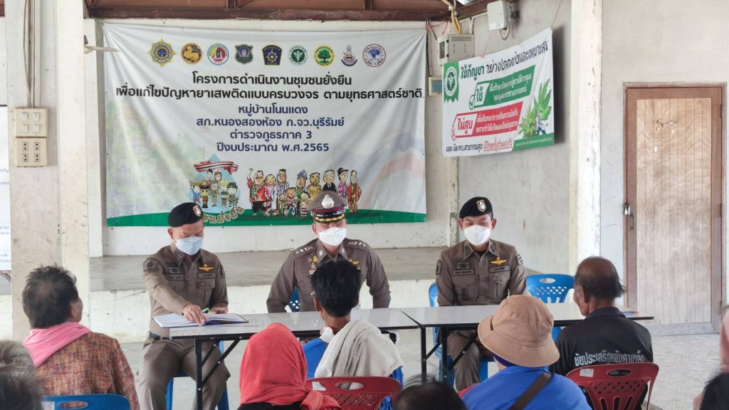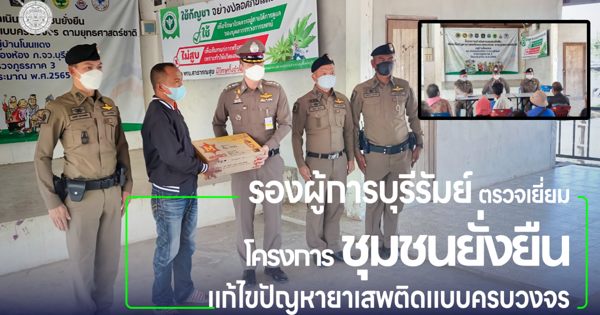 พ.ต.อ.ก้องชาติ เลี้ยงสมทรัพย์ รอง ผบก.ภ.จว.บุรีรัมย์ ได้มาตรวจเยี่ยมโคงการดำเนินงานชุมชนยั่งยืน เพื่อแก้ปัญหายาเสพติแบบครบวงจร ที่บ้านโนนแดง ม.4 ต.สะแกโพรง อ.เมือง จว.บุรีรัมย์ โดยมี พ.ต.อ.อนันต์ ทองบรรเทิง ผกก.สภ.หนองสองห้อง ,พ.ต.ท.สัญญา อุทุมพร รอง ผกก.ป.ฯ และ คุณคำลอง มั่นยืน ผู้ใหญ่บ้าน ให้การต้อนรับ และได้พบปะ เยี่ยมเยือน คณะกรรมการคุ้ม ผู้นำชุมชน ผู้เข้าร่วมโครงการ และประชาชนในพื้นที่ จากการสอบถามประชาชนมีความพึงพอใจในการแก้ไขปัญหายาเสพติดในพื้นที่ หลังจากนั้น พ.ต.อ.ก้องชาติฯ จึงได้มอบสิ่งของเป็นการบำรุงขวัญคณะทำงานฯ และกำชับการดำเนินงานให้เป็นไปด้วยความสม่ำเสมอ เพื่อเป็นการแก้ปัญหายาเสพติดให้กับชุมชนแบบครบวงจร