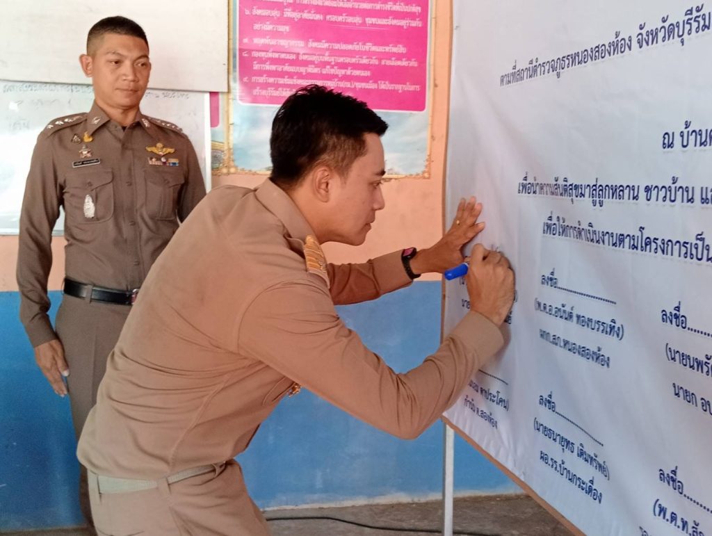จากนั้้นได้ร่วมลงนามบันทึกข้อตกลงให้ความร่วมมือ (MOU) , ประชาคมหมู่บ้านเพื่อตั้งกติการหมู่บ้าน ตามโครงการ ดังกล่าว ณ ศาลาประชาคมหมู่บ้าน บ้านศรีเพชร ต.สองห้อง อ.เมือง จว.บุรีรัมย์