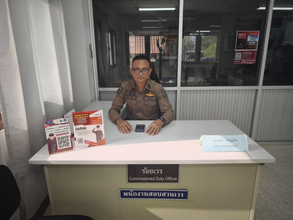 ส.ต.ต.สุริยาวุธ คำวงศ์ ผบ.หมู่(ป.)สภ.หนองสองห้อง/เจ้าหน้าทีป่ระชาสัมพันธ์ ทำการประชาสัมพันธ์ การตอบวัดการรับรู้ของผู้มีส่วนได้เสียภายนอก EIT ณ จุดบริการประชาชน One Stop Service